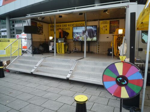 Auch auf der Frankfurter Buchmesse 2025 war Amnesty International wieder mit einem Stand vertreten. Im Zentrum stand der Amnesty-Stage-Truck mit seiner „Menschenrechtsbühne“.
